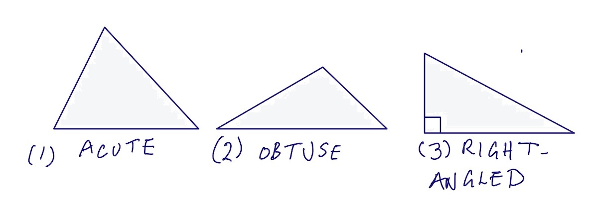 Triangles come in many flavours and I've sketched some below. Triangle can be classified by the size of their largest angle, or by how many equal sides they have. In this post I'm only looking at the first classification, by angle, and I'll look at classification by equal sides in another post.