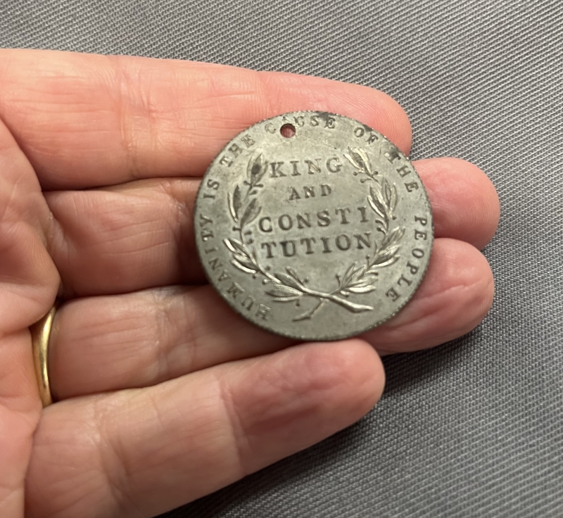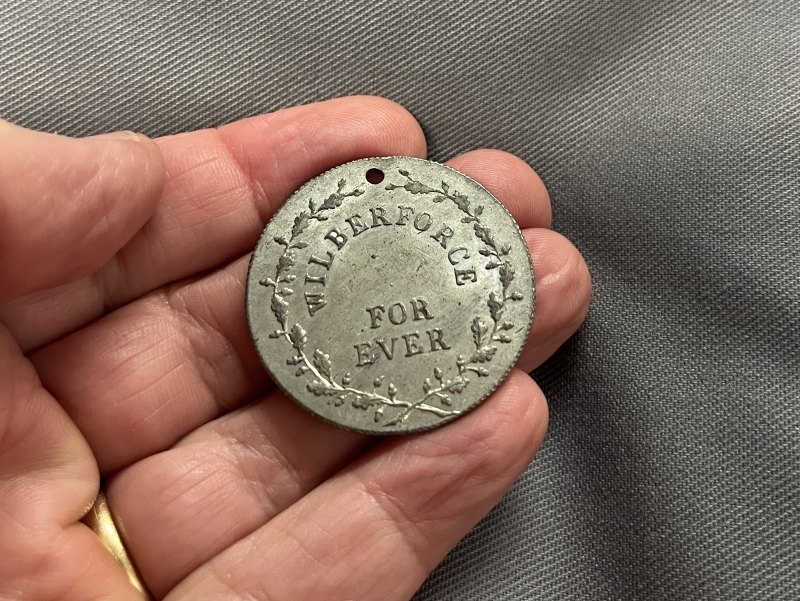 On one side there is an oak wreath and 'Wilberforce for ever'. The other side shows another wreath and the text: 'Humanity is the cause of the people' and 'King and Constitution' (felt there were lots of links possible with the idea of 'imagined communities'!) The medallion obviously allowed you to display your allegiance at the parliamentary election, I wonder whether it was also a marker that might have got you admission to the supporters' bars and refreshments?Â