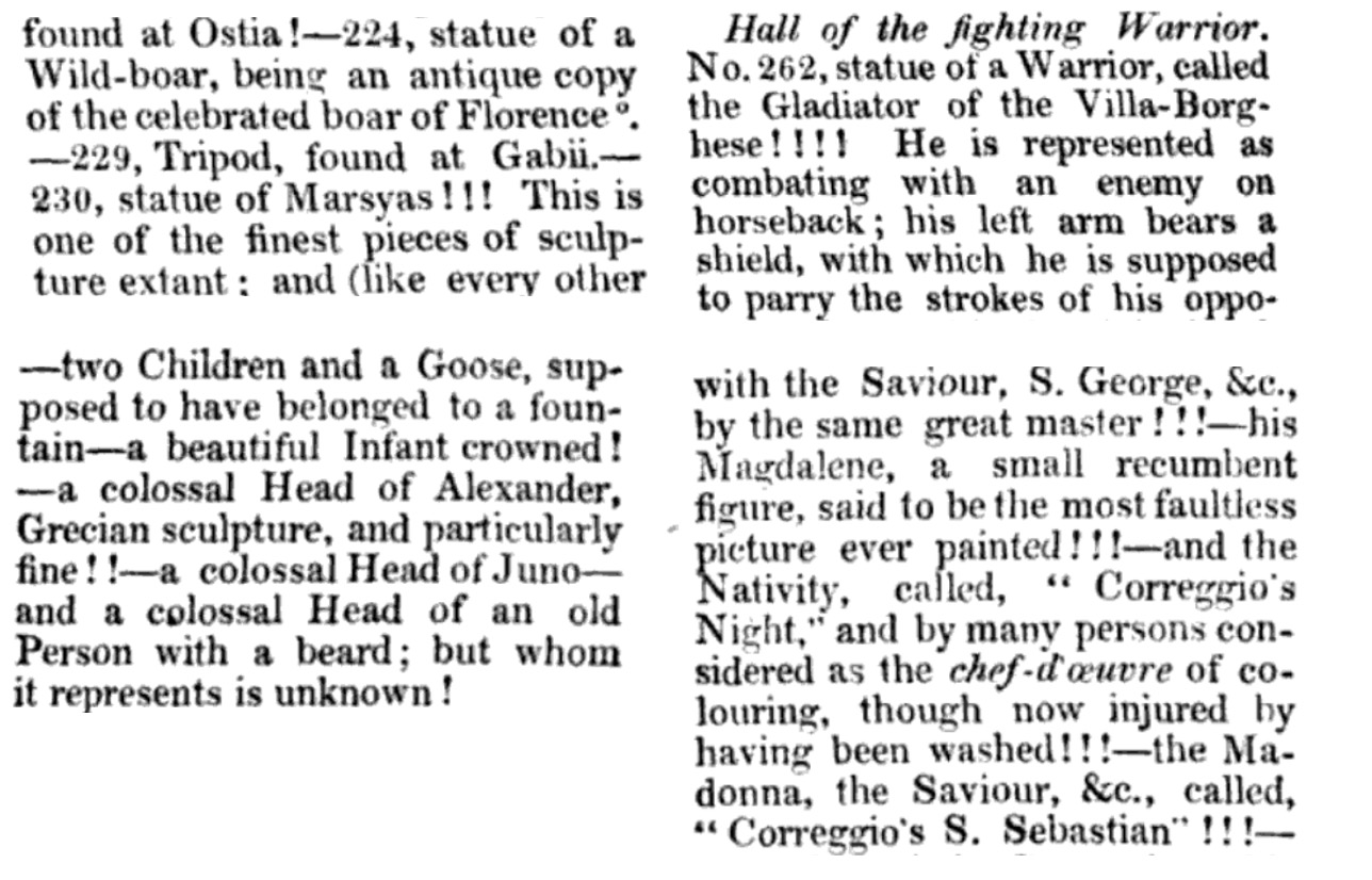 and many others. Wikipedia (of course!) has an article 'star (classification)' (not to be confused with 'stellar classification') and there we learn that a pioneer of such systems was Mariana Starke, who in 1820 published a guidebook Travels in Europe that rated arworks (presumably on a subject assessment of merit) using exclamation marks. I managed to find a scanned version of this forerunner of TripAdvisor in Google Books and sure enough we see the exclamation marks lined up against choice items. Here are some snippets.