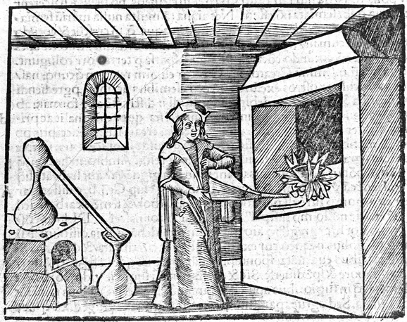 ¶ Woodcut of alchemist trying to transmute metals, circa 1503. Wellcome L0012391