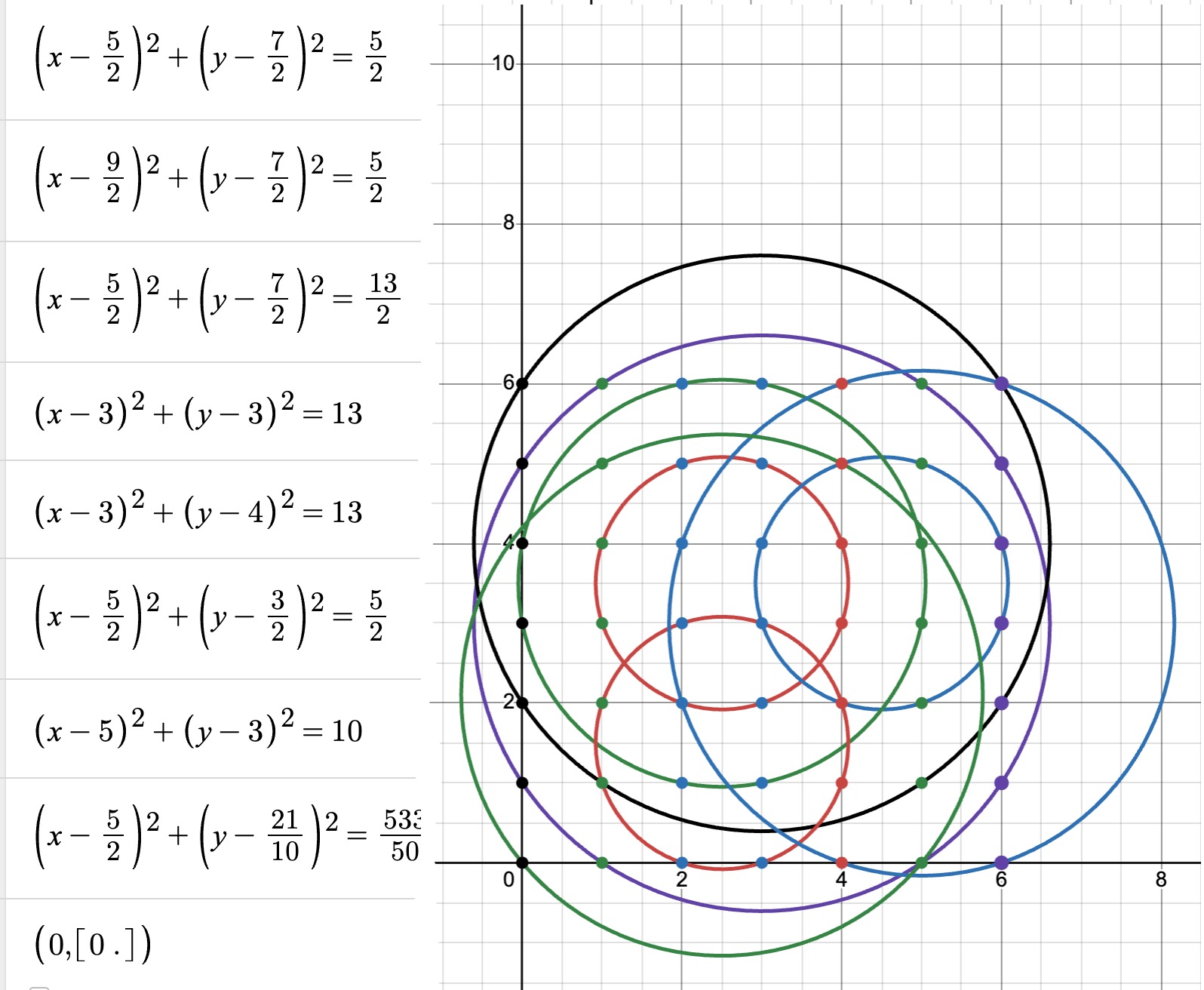 It quickly wrote and ran a Python program to do a search and after a minute or two came back with the equations of circles solving the 5 x 5 and 6 x 6 cases. I've not yet checked but I think they are essentially the solutions I've shown above. I felt very encouraged so then we moved on to the  7 x 7 case.