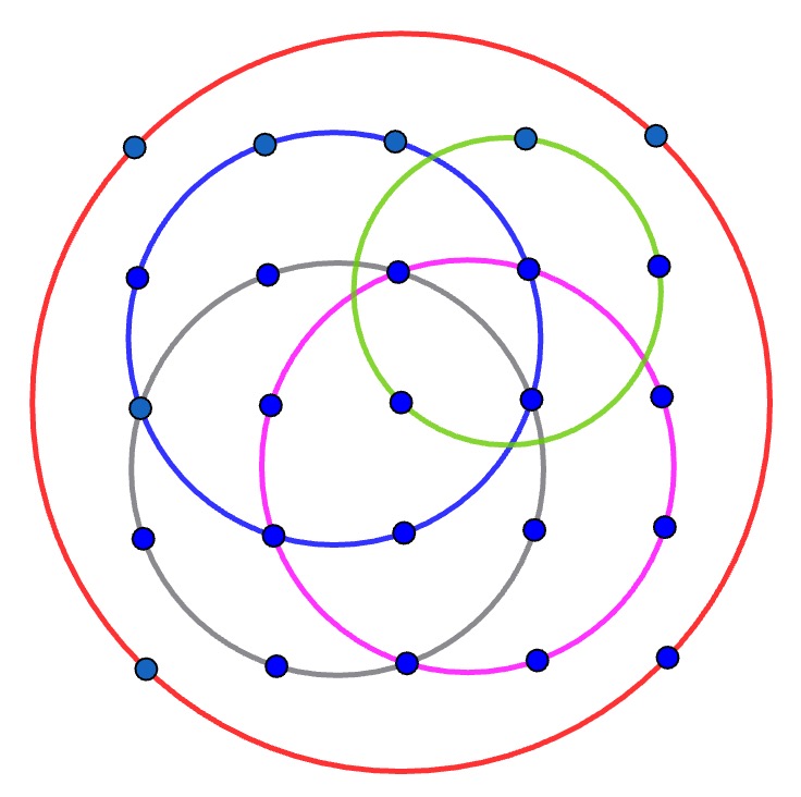 A few days ago I posted a puzzle I'd seen, to find five circles that would between them pass through all 25 dots in a square 5 x 5 grid. Here is the solution I gave, just found by using trial and error.