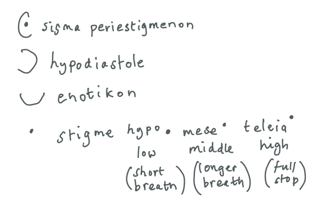 In the three types of stigme, "mark", you can already see the beginning of modern punctuation, although telling the difference between low and middle, or middle and high must have ben a bit hit-and miss sometimes. So now we keep them all on the same level, give low a tail, and make middle a hybrid of low and high. Genius or what.