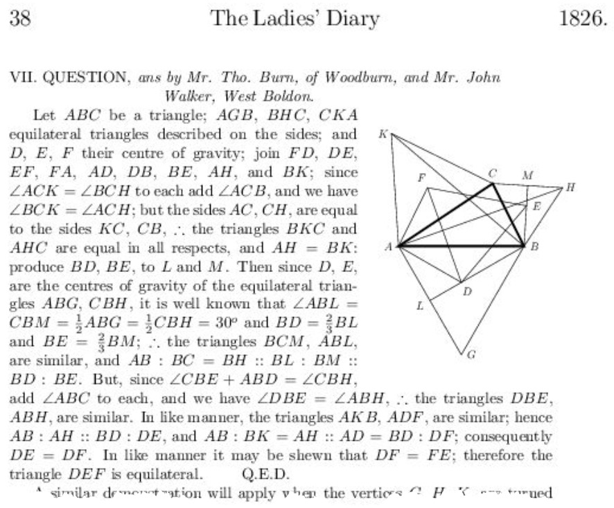 Napoleon's Theorem says that if we draw an arbitrary triangle and erect equilateral triangles on its sides, the centres of the triangles will form a equilateral triangle. Here is what may the first publication of this fact, in the 1826 edition of The Ladies Diary, which was very strong on mathematics at the time[1]. As you can see the proof is quite verbose and many shorter proof have been found. It's doubtful that Napoleon actually had anything to do with it but presumably somebody attributed it to him and it stuck.