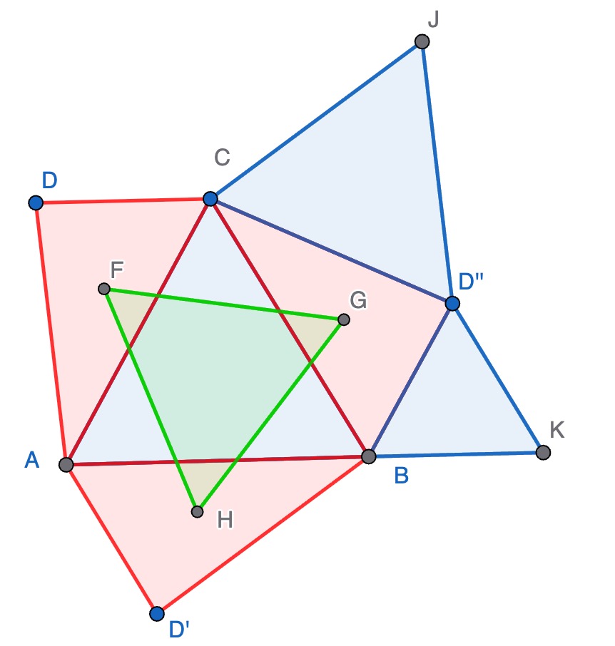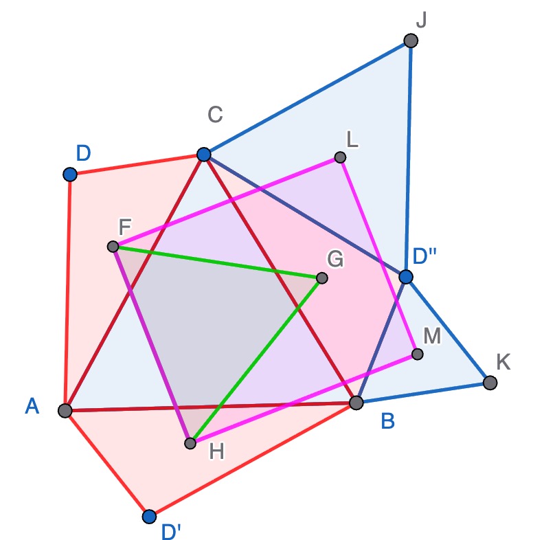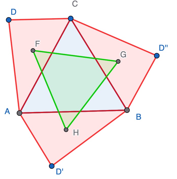 Which is rather neat! It's actually quite easy to see why it must be true, because each copy of the irregular triangle represents a 120° rotation of the previous one about the centre of the original equilateral triangle ABC, the whole figure has 3-fold rotational symmetry, any three corresponding points, for example D' D' and D'', are the vertices of an equliateral triangle.