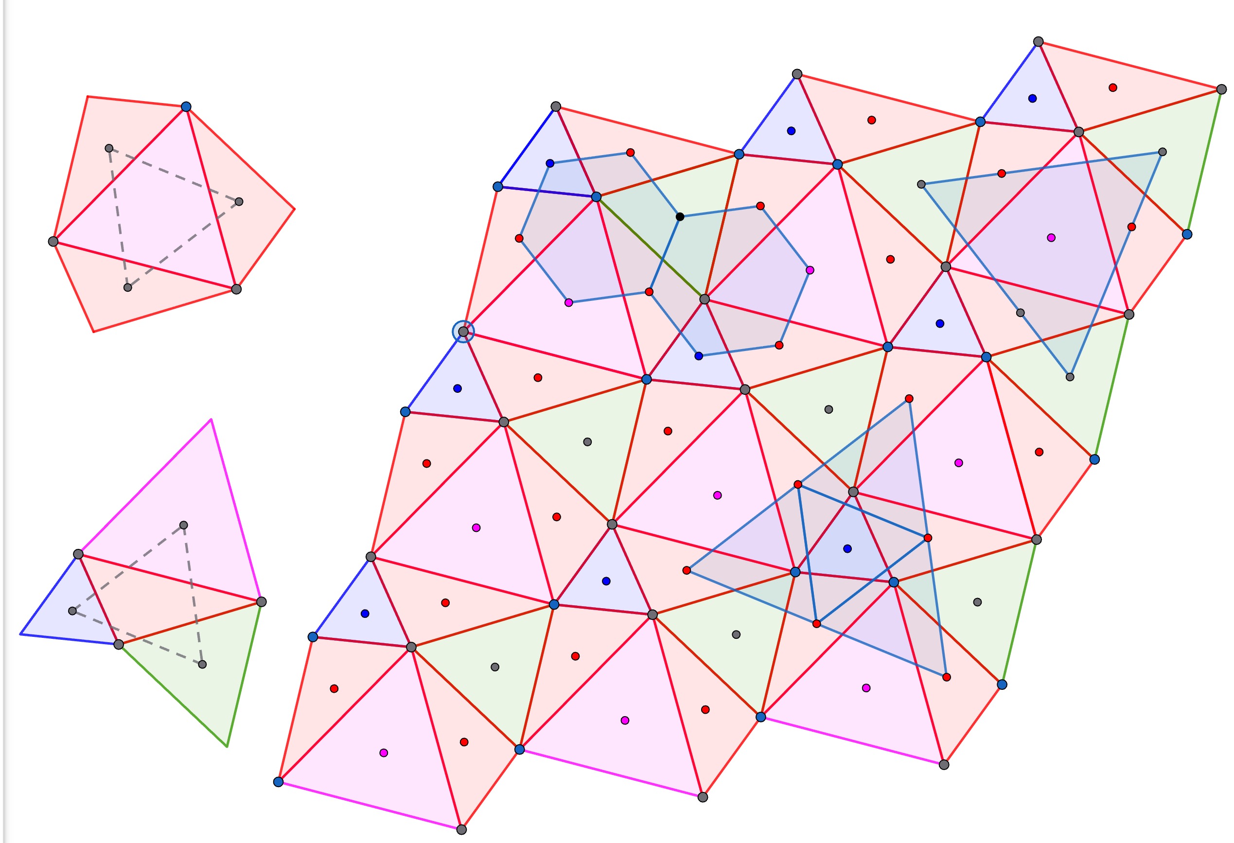 If we join up the centres of all the copies of a particular triangle (all the equilateral triangles of a particular size, or all the copies of the irregular triangle), we get a triangular lattice.