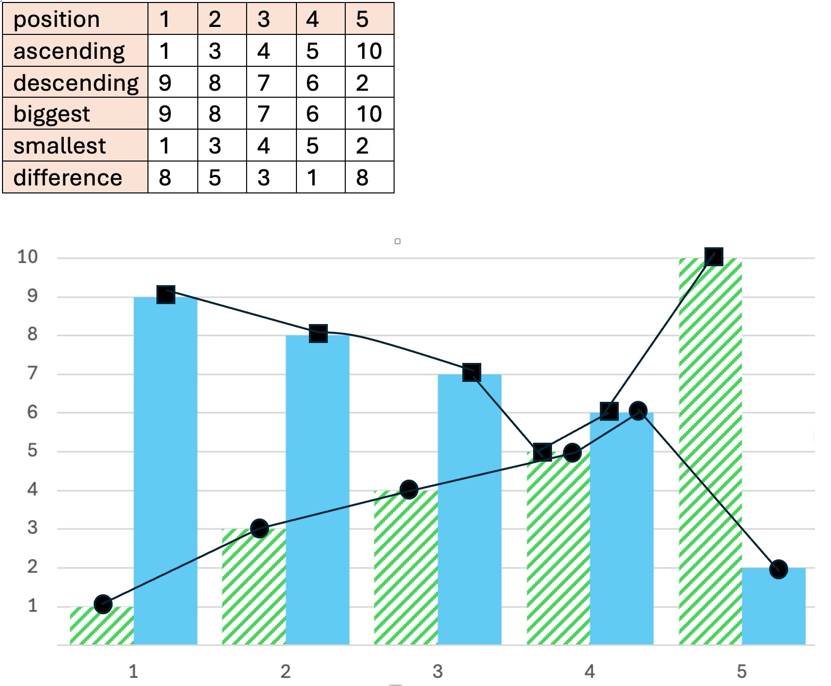 Take the integers and split them into two lists of 5 numbers any way you like. Arrange the numbers in the first group in ascending order and those in the second list in descending order. For example we might have