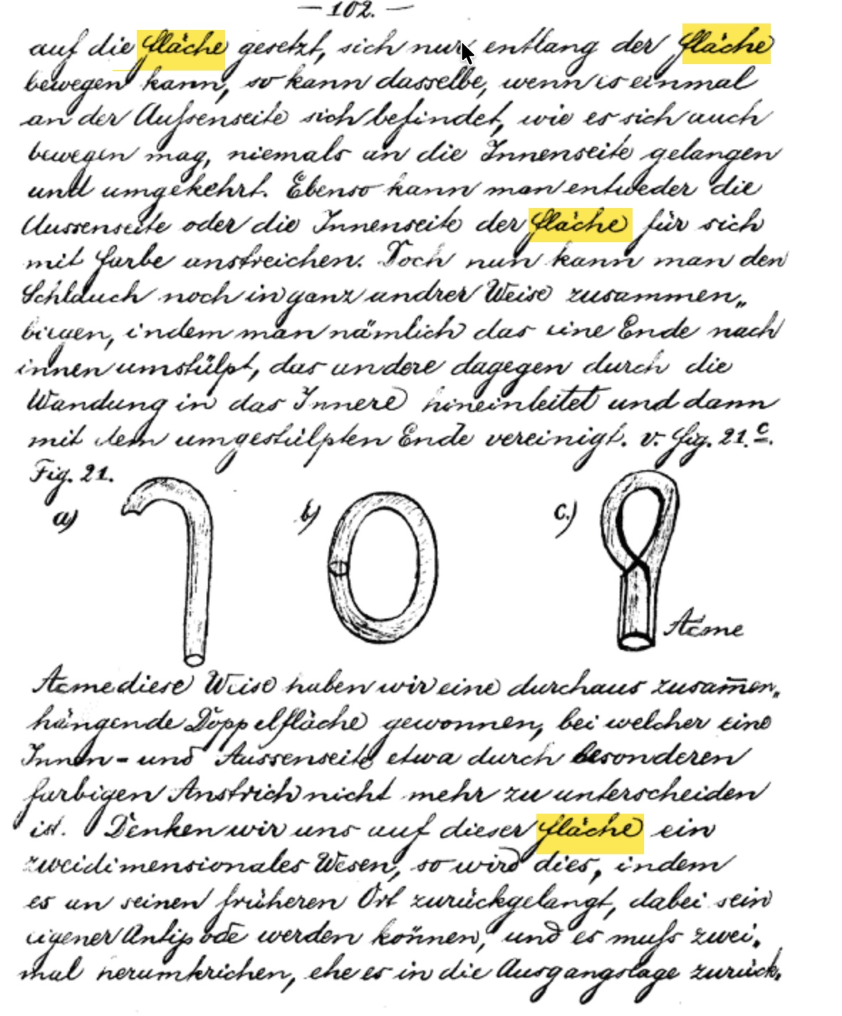 With a steer from Copilot I was able pick out and highlight Fläche in four places and you can judge for yourself whether it is legible. And as a bonus you get to see Klein's sketches where he is showing that if you just join the end of a cylinder in the obvious way you get an anchor-ring (or torus), but if you join them so the end have opposite orientation you get a one-sided surface.