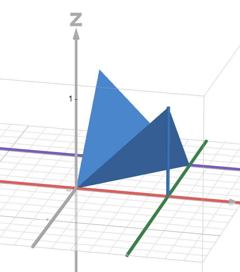 The volume is made up of two identical pyramids, with a valley between where and are equal and the distance is . The volume of a pyramid is given by . In this case the base of each pyramid is and its height so the volume is .