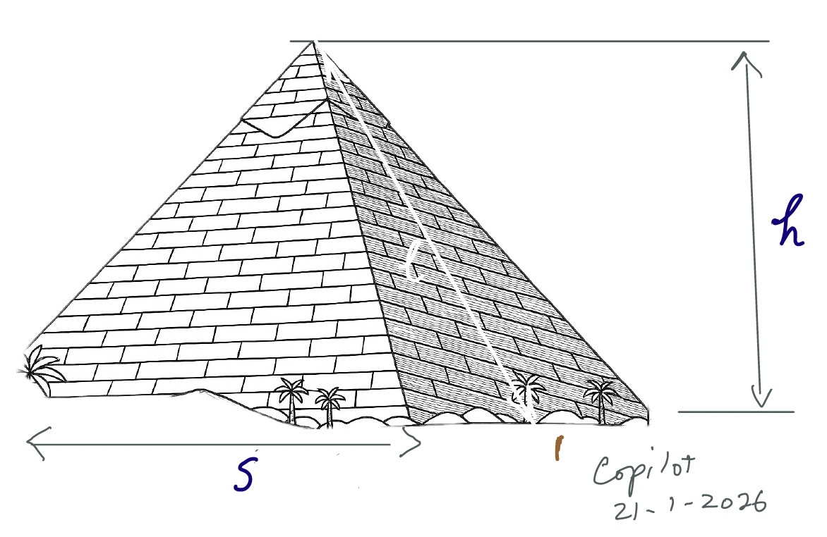 times the side length. It's worth noting that this makes the slant height to half side length ratio , so Pharaoh's new pyramid will be a bit pointier than that at Giza with its ratio of 1.623.